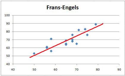regressie In een rechthoek met constante breedte is de oppervlakte evenredig met de lengte. In het spreidingsdiagram liggen de punten lengte-oppervlakte op een rechte. Voor de punten Frans-Engels kunnen we ook een best-passende rechte tekenen: Deze rechte noemen we de regressielijn. De vergelijking van deze rechte geeft het verband weer tussen de punten Frans en Engels