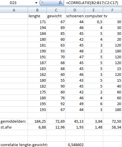berekenen van correlatiecoëficiënt In Excel is de correlatiecoëficiënt ingebouwd als functie. Let op de manier van selecteren van de gegevens: scheidt de twee reeksen door een kommapunt: